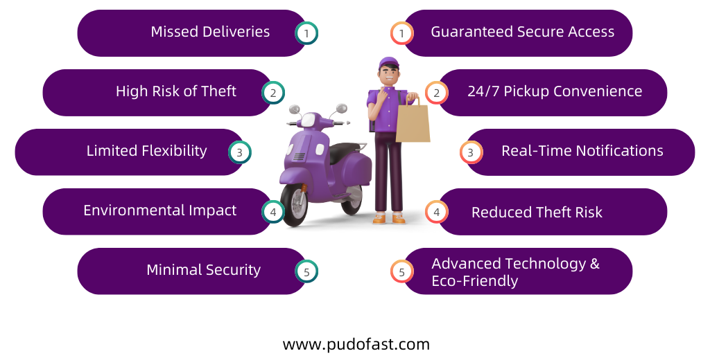 - Package theft: Thefts are one of the main issues associated with doorstep deliveries of traditional ones. With PUDO Fast lockboxes, the courier still has the delivery until it is handed over to the recipient.